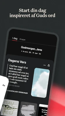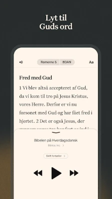 Bibel App'en er mere end blot en læseoplevelse; det er et blomstrende fællesskab og et omfattende studieværktøj. Forbind med venner for at udforske bibelske sandheder sammen, udveksle tanker og deltage i meningsfulde samtaler om tro. Dyk ned i tusindvis af læseplaner og andagter, der er designet til at berige din daglige vandring og give dig dybere indsigt. Med en gratis YouVersion-konto synkroniseres alle dine personlige tilføjelser – fra noter og markeringer til læseplaner – problemfrit på tværs af alle dine enheder, sikrende at dit personlige studie altid er lige ved hånden. Nyd desuden optimal læsekomfort med justerbare skrifttyper, tekststørrelse og mørk tilstand.