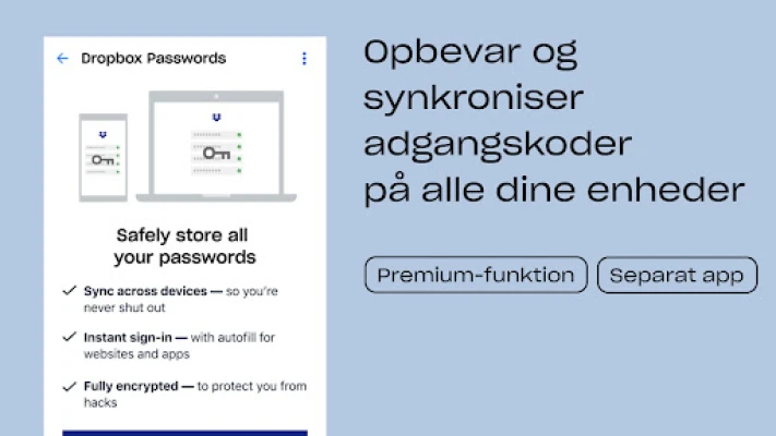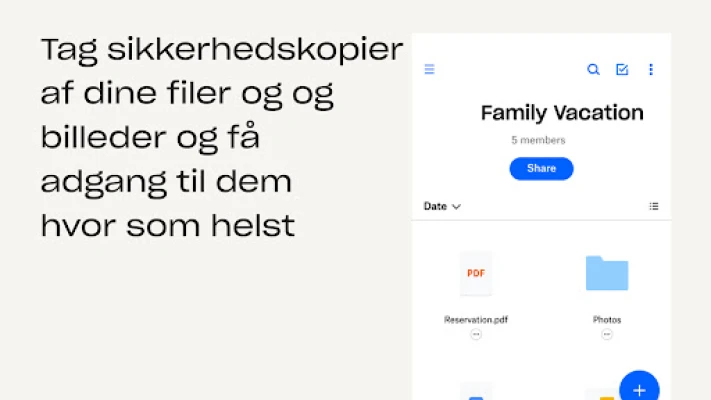 Dropbox sikrer, at dine filer altid er beskyttede, organiserede og tilgængelige. Del nemt store som små filer via link. Opbevar alle vigtige dokumenter ét sikkert sted, og lav nemt sikkerhedskopi af dine enheder. Scan og organiser filer effektivt.