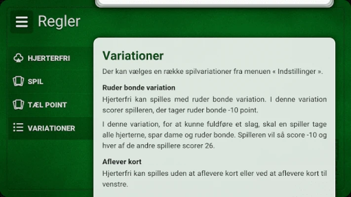 For at fuldende din spiloplevelse indeholder applikationen detaljeret statistik, så du kan følge din fremgang og analysere dine spil. Skulle du være i tvivl om reglerne, finder du en komplet og letforståelig vejledning lige ved hånden, altid tilgængelig i applikationen. Og du behøver aldrig at bekymre dig om uforudsete afbrydelser; med den indbyggede håndsikkerhedskopi kan du altid genoptage dit spil præcis der, hvor du slap. Lad dig fordybe i timevis af engagerende kortspil, hvor hver eneste beslutning tæller. Glæd dig til at opleve Hjerterfri som aldrig før.
